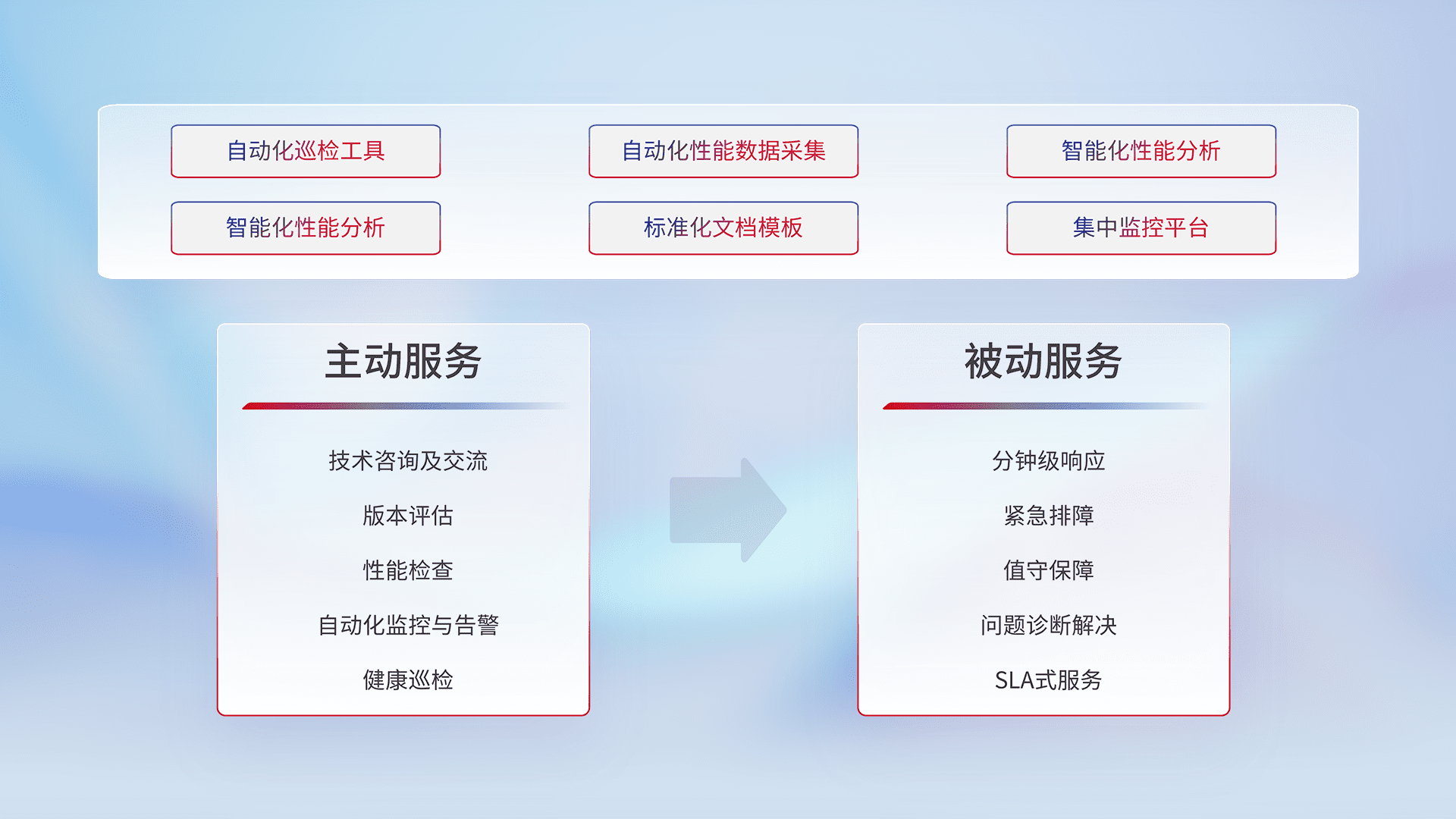 智能化工具和标准化文档,,保障服务质量,,提供主动服务(包含技术咨询、、、、版本评估、、、性能检查、、、、自动化监控与告警、、、、健康巡检)和被动服务包含(分钟级响应、、、紧急排障、、、、值守保障、、问题诊断解决、、SLA服务)。。